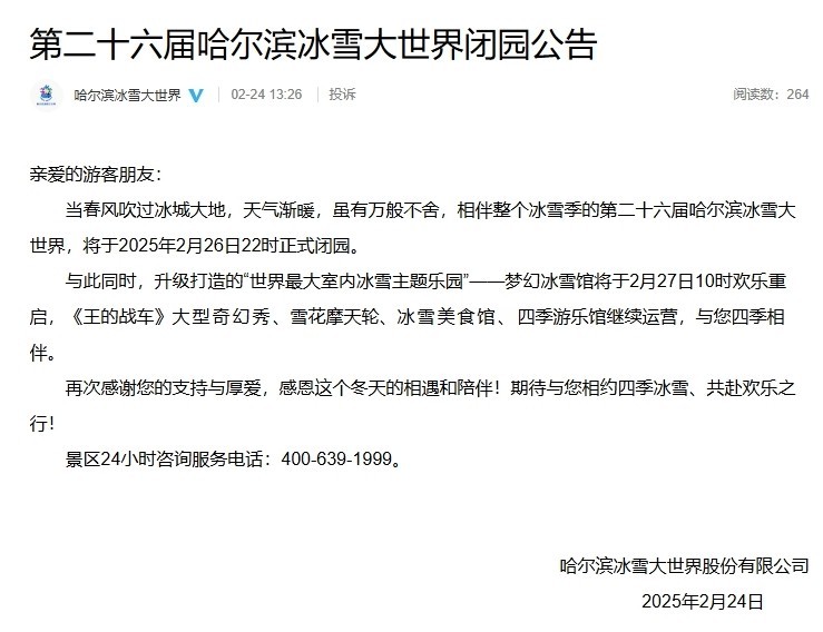 中新网2月24日电 据哈尔滨冰雪大世界微博消息,哈尔滨冰雪大世界股份有限公司24日发布公告称,第二十六届哈尔滨冰雪大世界将于2025年2月26日22时正式闭园。